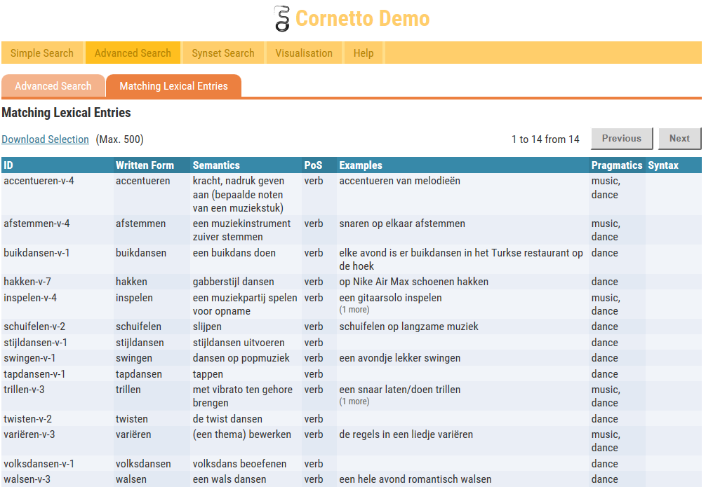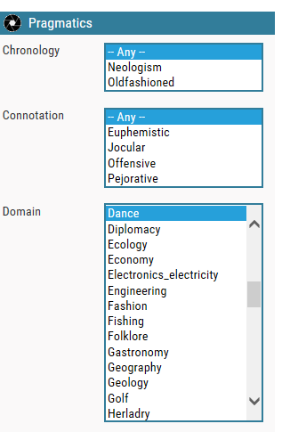 For example, the user wants to search for all the words in the Dance domain. Then he has to select ‘Dance’ in the pragmatic section (Domain). (78 entries will be found). If he wants to select only the verbs of the Dance domain he adds a constraint on Part-of-speech in the syntax section: