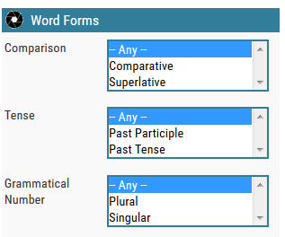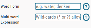 The Advanced Search form permits you to select specific lexical entries from the resource. All properties of the lexical entries can be used as selection criteria. Since in Advanced Search there are many options available, they are grouped in sections. The sections are distributed over three rows on the screen, and every section can be collapsed or closed by clicking on the circle.